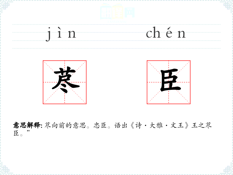 荩向前的意思。忠臣。语出《诗·大雅·文王》王之荩臣。”