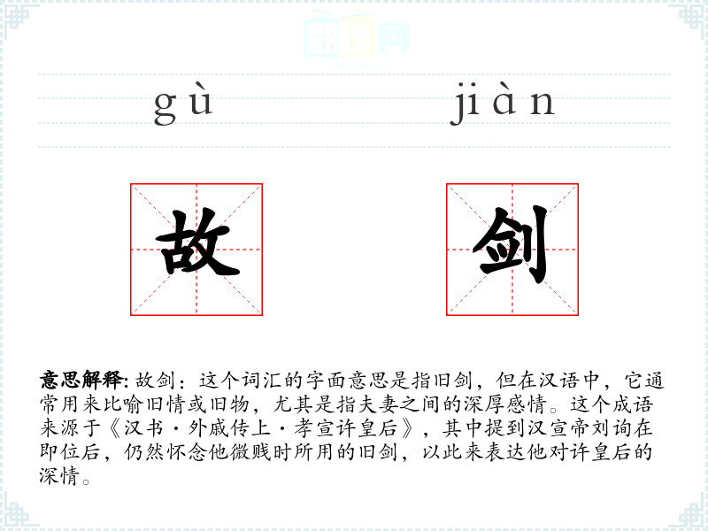 故剑:这个词汇的字面意思是指旧剑,但在汉语中,它通常用来比喻旧情或旧物,尤其是指夫妻之间的深厚感情。这个成语来源于《汉书·外戚传上·孝宣许皇后》,其中提到汉宣帝刘询在即位后,仍然怀念他微贱时所用的旧剑,以此来表达他对许皇后的深情。