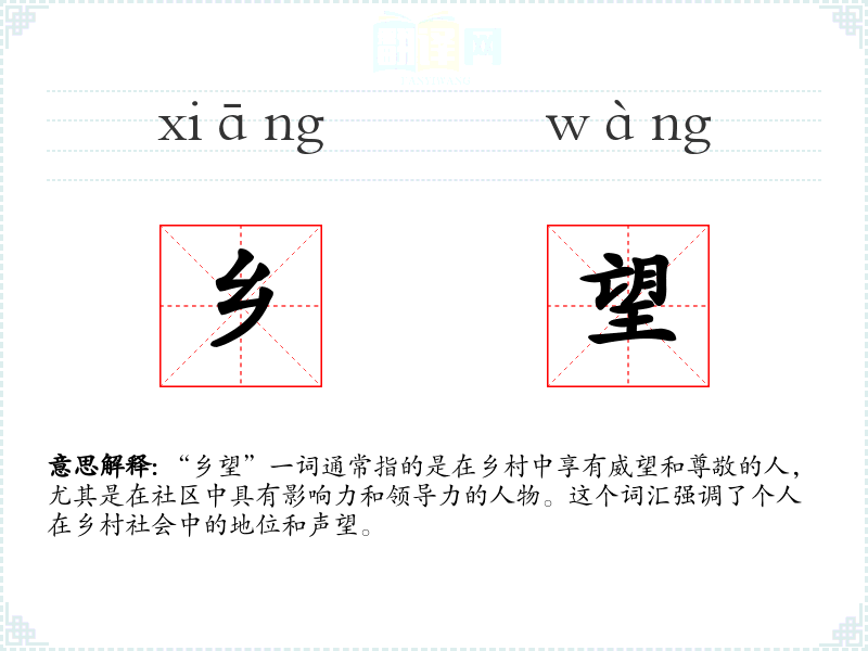 “乡望”一词通常指的是在乡村中享有威望和尊敬的人,尤其是在社区中具有影响力和领导力的人物。这个词汇强调了个人在乡村社会中的地位和声望。
