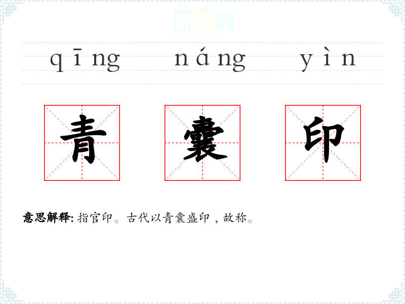 指官印。古代以青囊盛印﹐故称。