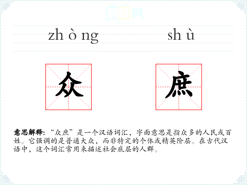 - 反义词:贵族、精英、上层。这些词汇与“众庶”形成鲜明对比,指代社会中的特权阶层。