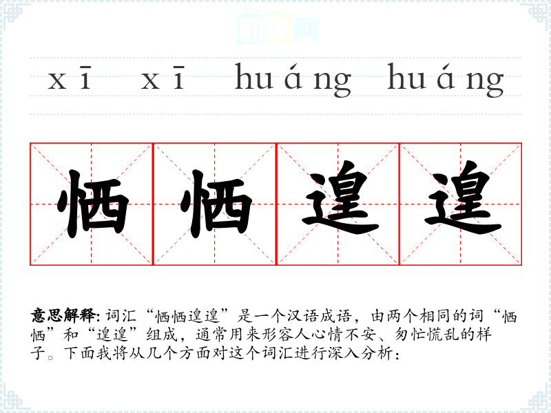 词汇“恓恓遑遑”是一个汉语成语,由两个相同的词“恓恓”和“遑遑”组成,通常用来形容人心情不安、匆忙慌乱的样子。下面我将从几个方面对这个词汇进行深入分析: