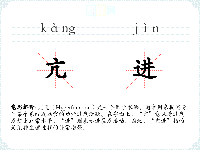 “亢进”一词源自汉语,其中“亢”字古已有之,意为高、过度,而“进”字则表示前进、发展。在医学领域,这个词被用来描述生理功能的异常增强,随着医学术语的标准化,其使用逐渐固定。