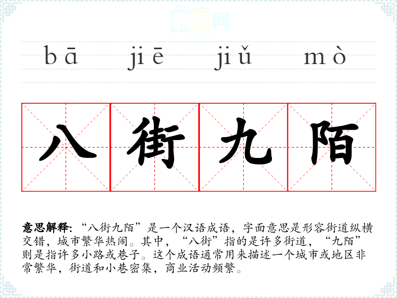 “八街九陌”是一个汉语成语,字面意思是形容街道纵横交错,城市繁华热闹。其中,“八街”指的是许多街道,“九陌”则是指许多小路或巷子。这个成语通常用来描述一个城市或地区非常繁华,街道和小巷密集,商业活动频繁。
