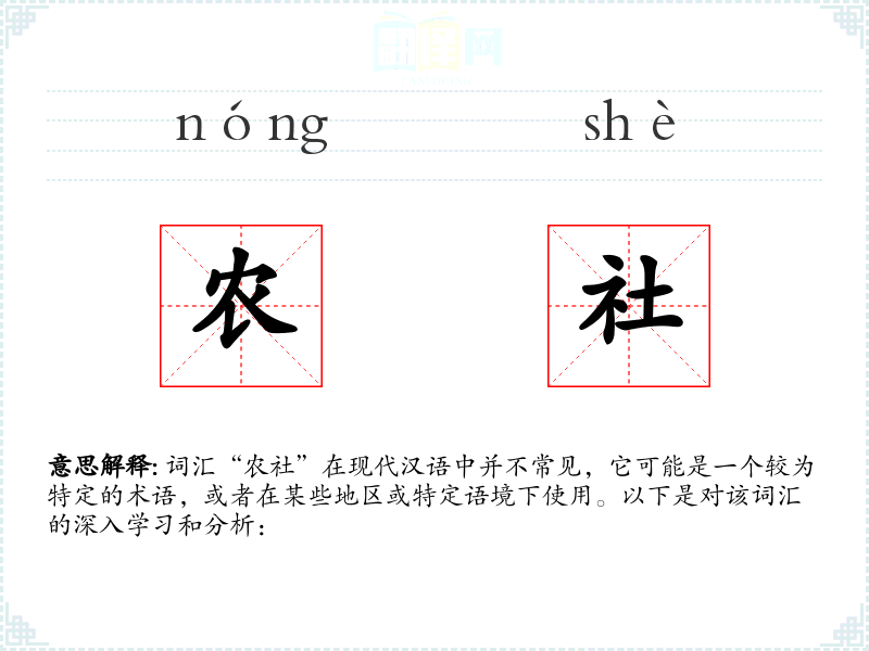词汇“农社”在现代汉语中并不常见,它可能是一个较为特定的术语,或者在某些地区或特定语境下使用。以下是对该词汇的深入学*和分析: