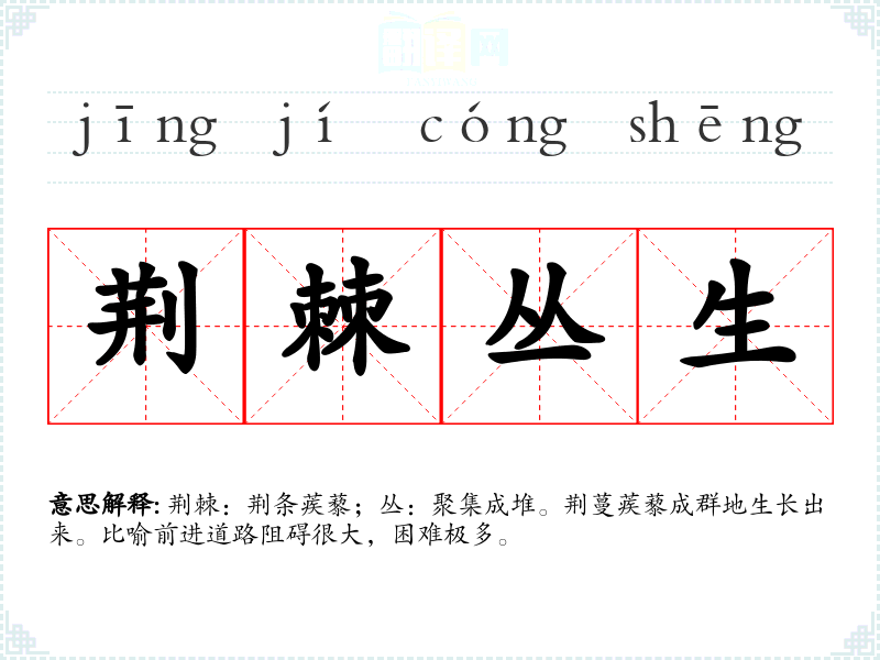 荆棘:荆条蒺藜;丛:聚集成堆。荆蔓蒺藜成群地生长出来。比喻前进道路阻碍很大,困难极多。