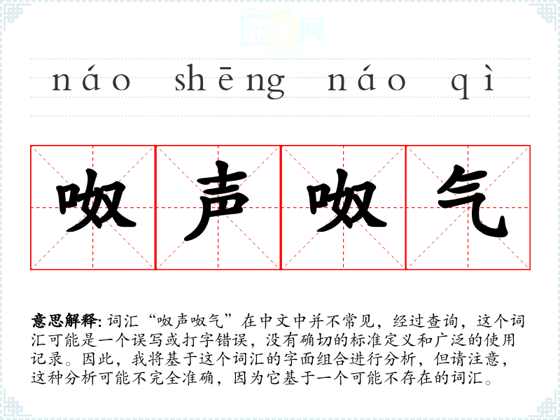 词汇“呶声呶气”在中文中并不常见,经过查询,这个词汇可能是一个误写或打字错误,没有确切的标准定义和广泛的使用记录。因此,我将基于这个词汇的字面组合进行分析,但请注意,这种分析可能不完全准确,因为它基于一个可能不存在的词汇。