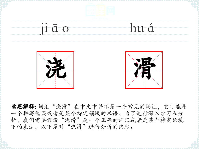 词汇“浇滑”在中文中并不是一个常见的词汇,它可能是一个拼写错误或者是某个特定领域的术语。为了进行深入学习和分析,我们需要假设“浇滑”是一个正确的词汇或者是某个特定语境下的表达。以下是对“浇滑”进行分析的内容: