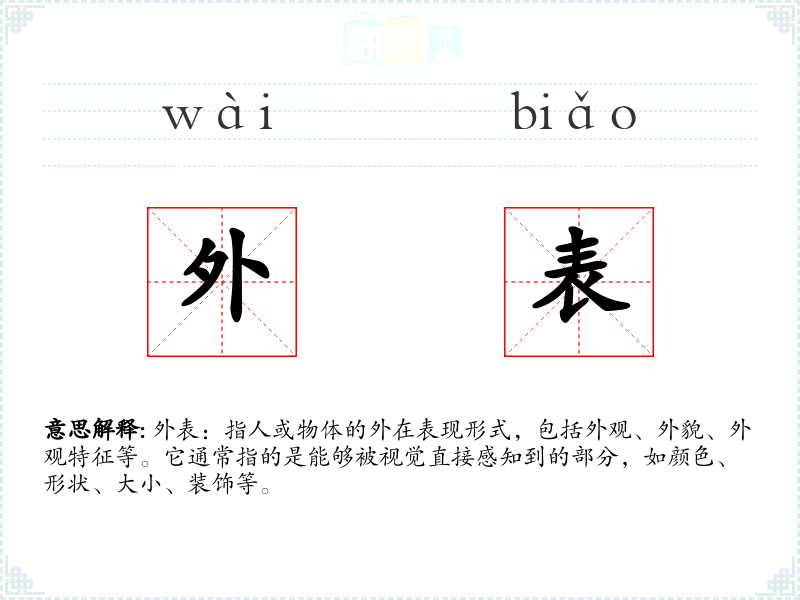外表一词源自汉语,由“外”和“表”两个字组成。在古代汉语中,“外”指外部,“表”指表面,合起来即指外部的表面。随着语言的发展,这个词的含义逐渐固定,成为描述人或物体外在特征的常用词汇。