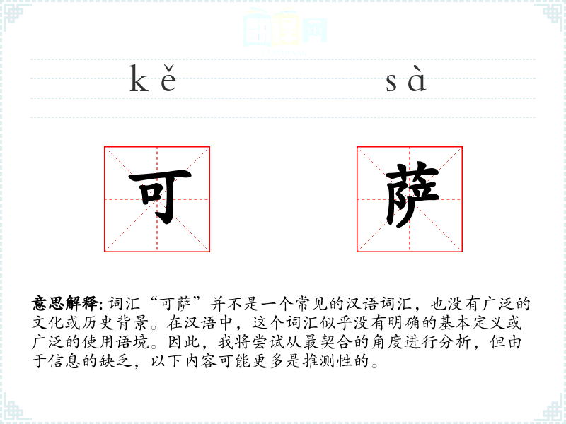 由于“可萨”在汉语中没有明确的定义,我们无法提供一个准确的字面意思和基本含义。如果这是一个外来词汇,可能需要考虑其原始语言的含义。