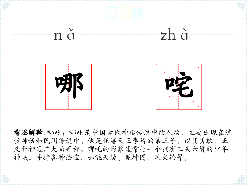 哪吒:哪吒是**古代神话传说中的人物,主要出现在道教神话和民间传说中。他是托塔天王李靖的第三子,以其勇敢、正义和神通广大而著称。哪吒的形象通常是一个拥有三头六臂的少年神祇,手持各种法宝,如混天绫、乾坤圈、风火轮等。