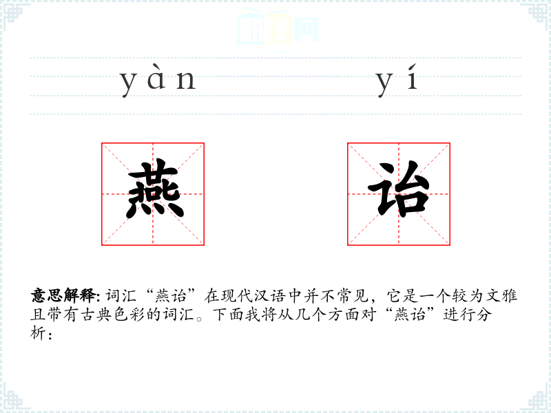 词汇“燕诒”在现代汉语中并不常见,它是一个较为文雅且带有古典色彩的词汇。下面我将从几个方面对“燕诒”进行分析: