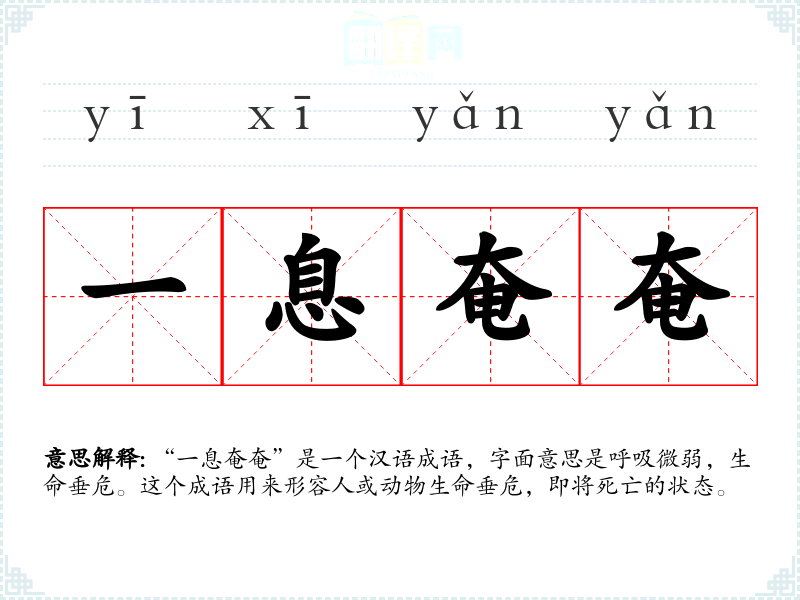 “一息奄奄”是一个汉语成语,字面意思是呼吸微弱,生命垂危。这个成语用来形容人或动物生命垂危,即将死亡的状态。