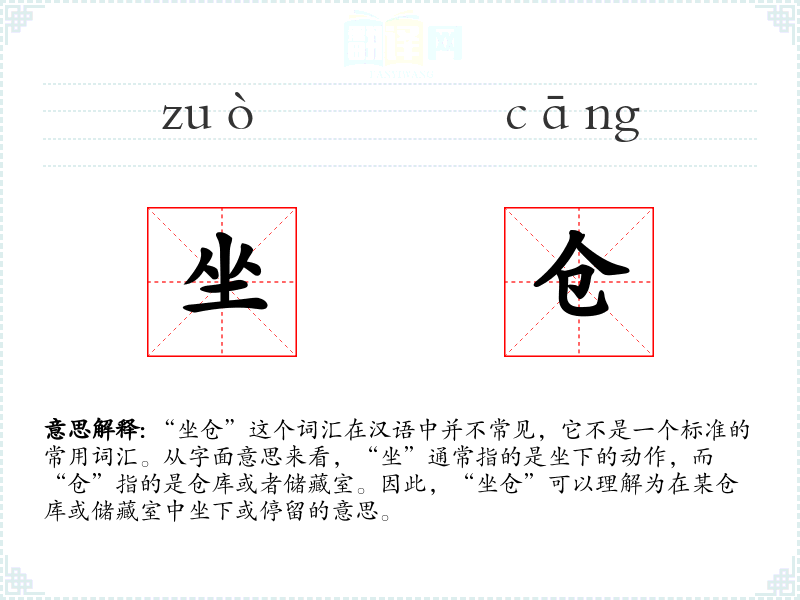 同义词:暂无明确的同义词,因为“坐仓”不是一个常用词汇。 反义词:暂无明确的反义词。