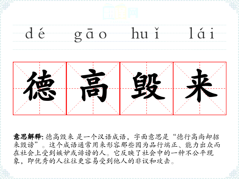 德高毁来 是一个汉语成语,字面意思是“德行高尚却招来毁谤”。这个成语通常用来形容那些因为品行端正、能力出众而在社会上受到嫉妒或诽谤的人。它反映了社会中的一种不公平现象,即优秀的人往往更容易受到他人的非议和攻击。