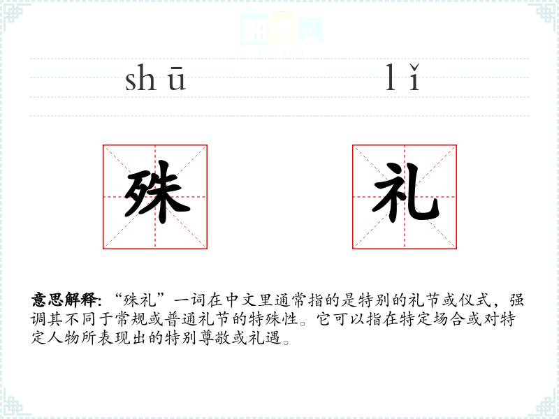“殊礼”一词在中文里通常指的是特别的礼节或仪式,强调其不同于常规或普通礼节的特殊性。它可以指在特定场合或对特定人物所表现出的特别尊敬或礼遇。