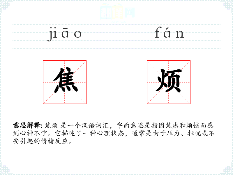 焦烦 是一个汉语词汇,字面意思是指因焦虑和烦恼而感到心神不宁。它描述了一种心理状态,通常是由于压力、担忧或不安引起的情绪反应。