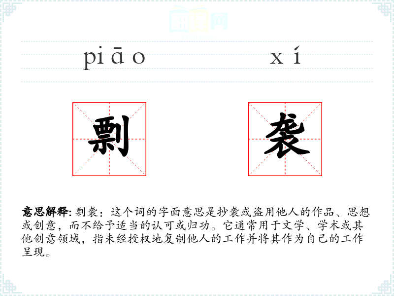 剽袭:这个词的字面意思是抄袭或盗用他人的作品、思想或创意,而不给予适当的认可或归功。它通常用于文学、学术或其他创意领域,指未经授权地复制他人的工作并将其作为自己的工作呈现。