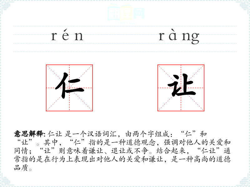 “仁”字最早见于甲骨文,原意是指两个人之间的关系,后来演变为指人与人之间的亲和与关爱。“让”字则有退让、谦让的意思。两者结合的“仁让”在古代文献中已有记载,如《论语》等儒家经典中频繁出现。
