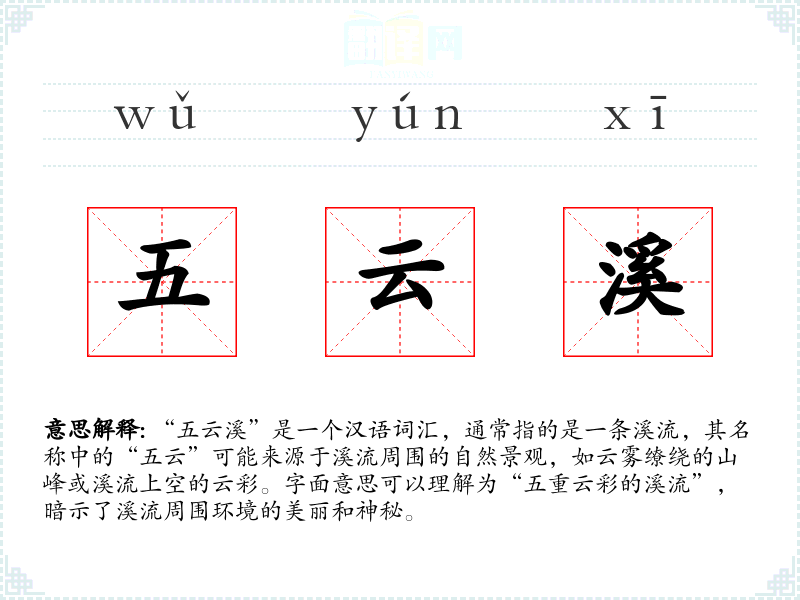 “五云溪”的词源可能与古代文人对自然景观的诗意描绘有关,随着时间的推移,这个词汇逐渐被用来指代特定的美丽溪流。在语言的演变中,它可能从一个具体的地点名称扩展为一个带有文学色彩的通用词汇。