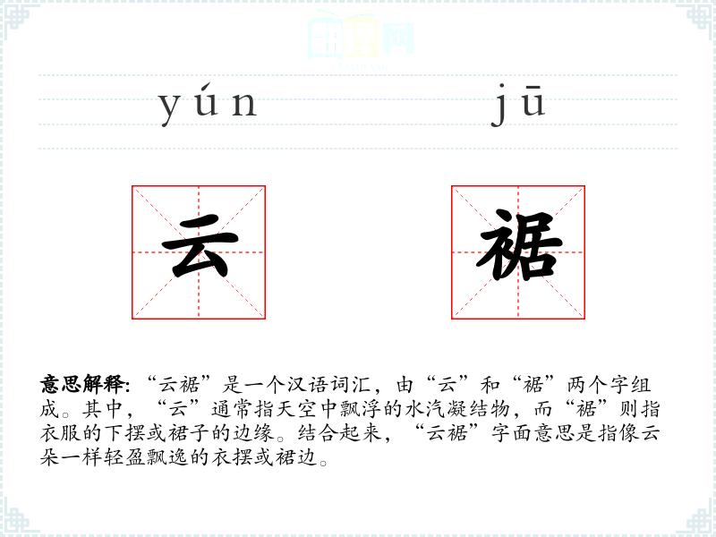 “云裾”是一个汉语词汇,由“云”和“裾”两个字组成。其中,“云”通常指天空中飘浮的水汽凝结物,而“裾”则指衣服的下摆或裙子的边缘。结合起来,“云裾”字面意思是指像云朵一样轻盈飘逸的衣摆或裙边。