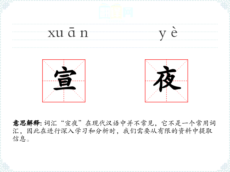 词汇“宣夜”在现代汉语中并不常见,它不是一个常用词汇,因此在进行深入学习和分析时,我们需要从有限的资料中提取信息。