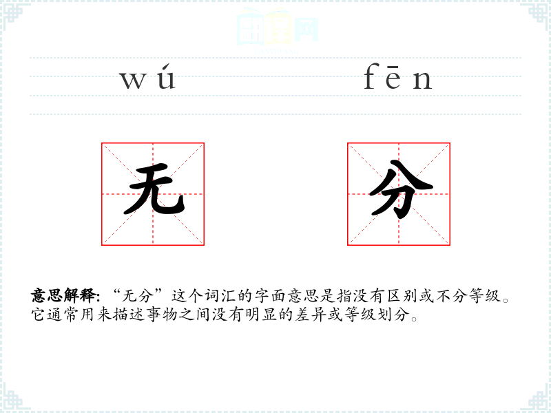 “无分”这个词汇的字面意思是指没有区别或不分等级。它通常用来描述事物之间没有明显的差异或等级划分。
