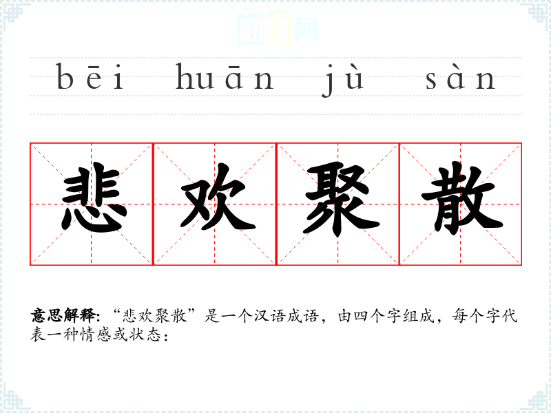 “悲欢聚散”是一个汉语成语,由四个字组成,每个字代表一种情感或状态: