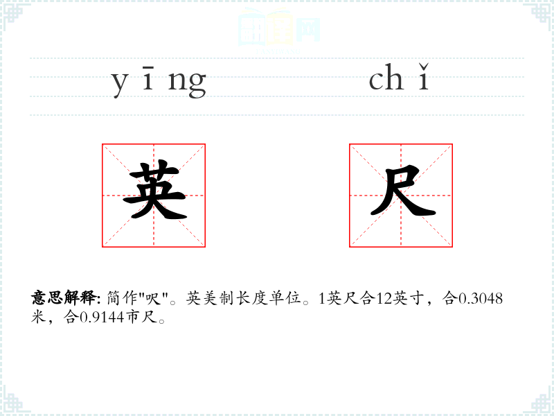 简作"呎"。英美制长度单位。1英尺合12英寸,合0.3048米,合0.9144市尺。