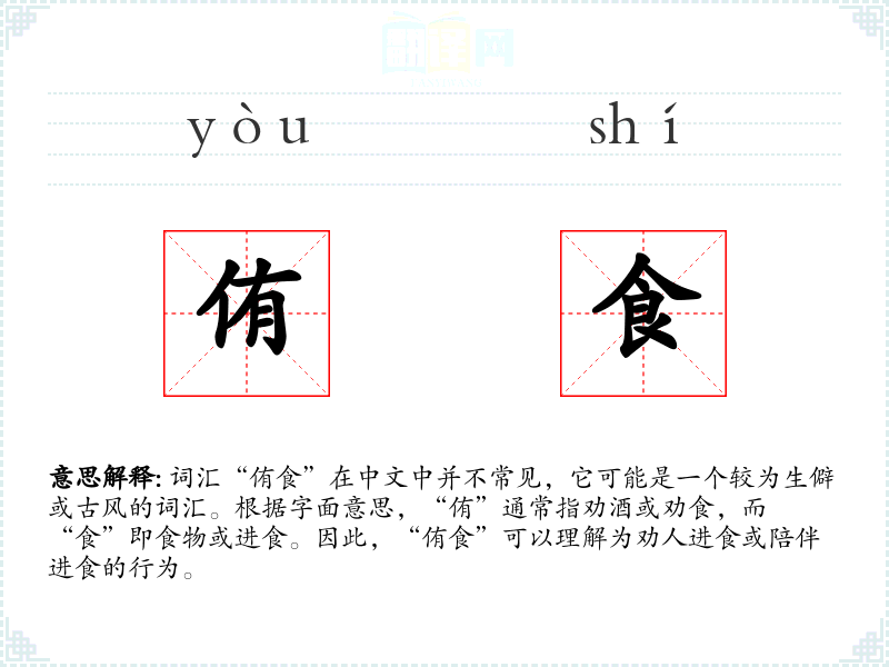 - 词源:“侑”字在古代汉语中就有劝酒、劝食的含义,而“食”字则一直指食物或进食。