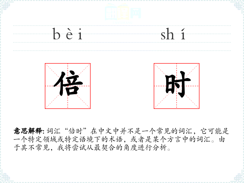 词汇“倍时”在中文中并不是一个常见的词汇,它可能是一个特定领域或特定语境下的术语,或者是某个方言中的词汇。由于其不常见,我将尝试从最契合的角度进行分析。
