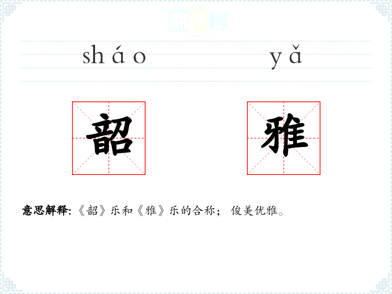 《韶》乐和《雅》乐的合称; 俊美优雅。