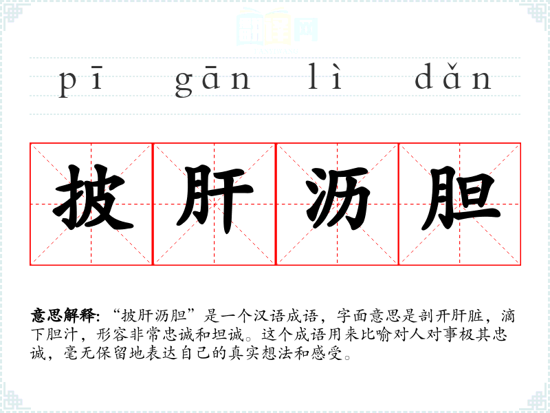 “披肝沥胆”是一个汉语成语,字面意思是剖开肝脏,滴下胆汁,形容非常忠诚和坦诚。这个成语用来比喻对人对事极其忠诚,毫无保留地表达自己的真实想法和感受。