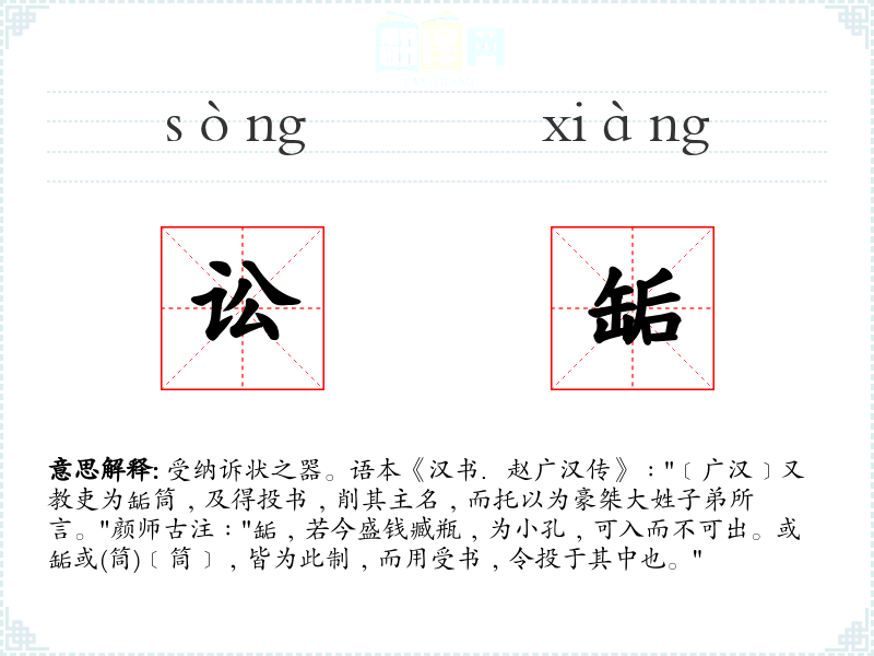 1.受纳诉状之器。语本《汉书.赵广汉传》﹕"﹝广汉﹞又教吏为缿筒﹐及得投书﹐削其主名﹐而托以为豪桀大姓子弟所言。"颜师古注﹕"缿﹐若今盛钱臧瓶﹐为小孔﹐可入而不可出。或缿或(筒)﹝筒﹞﹐皆为此制﹐而用受书﹐令投于其中也。"