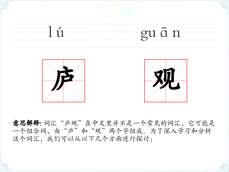 词汇“庐观”在中文里并不是一个常见的词汇,它可能是一个组合词,由“庐”和“观”两个字组成。为了深入学*和分析这个词汇,我们可以从以下几个方面进行探讨: