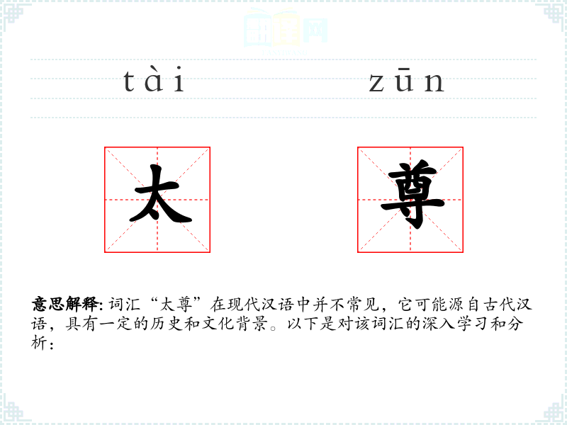 词汇“太尊”在现代汉语中并不常见,它可能源自古代汉语,具有一定的历史和文化背景。以下是对该词汇的深入学*和分析: