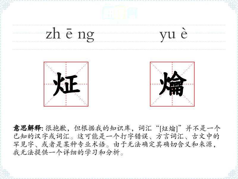 很抱歉,但根据我的知识库,词汇“[炡爚]”并不是一个已知的汉字或词汇。这可能是一个打字错误、方言词汇、古文中的罕见字、或者是某种专业术语。由于无法确定其确切含义和来源,我无法提供一个详细的学习和分析。