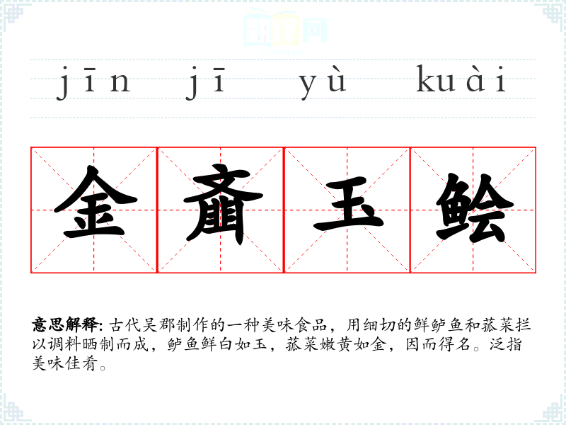 古代吴郡制作的一种美味食品,用细切的鲜鲈鱼和菰菜拦以调料晒制而成,鲈鱼鲜白如玉,菰菜嫩黄如金,因而得名。泛指