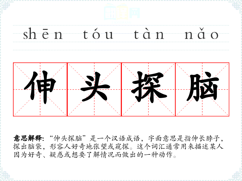 “伸头探脑”这个词汇的词源较为直接,由“伸头”和“探脑”两个动作组合而成,形象地描述了人的一种行为。在古代文献中,类似的表达方式也常见,但这个特定的成语可能是随着时间的推移逐渐形成的。