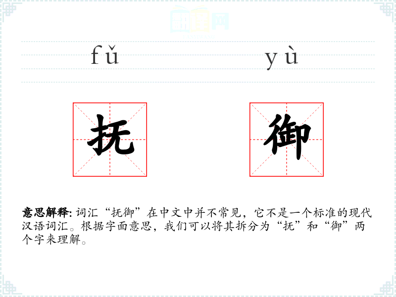 词汇“抚御”在中文中并不常见,它不是一个标准的现代汉语词汇。根据字面意思,我们可以将其拆分为“抚”和“御”两个字来理解。