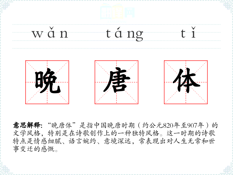 “晚唐体”是指**晚唐时期(约公元820年至907年)的文学风格,特别是在诗歌创作上的一种独特风格。这一时期的诗歌特点是情感细腻、语言婉约、意境深远,常表现出对人生无常和世事变迁的感慨。