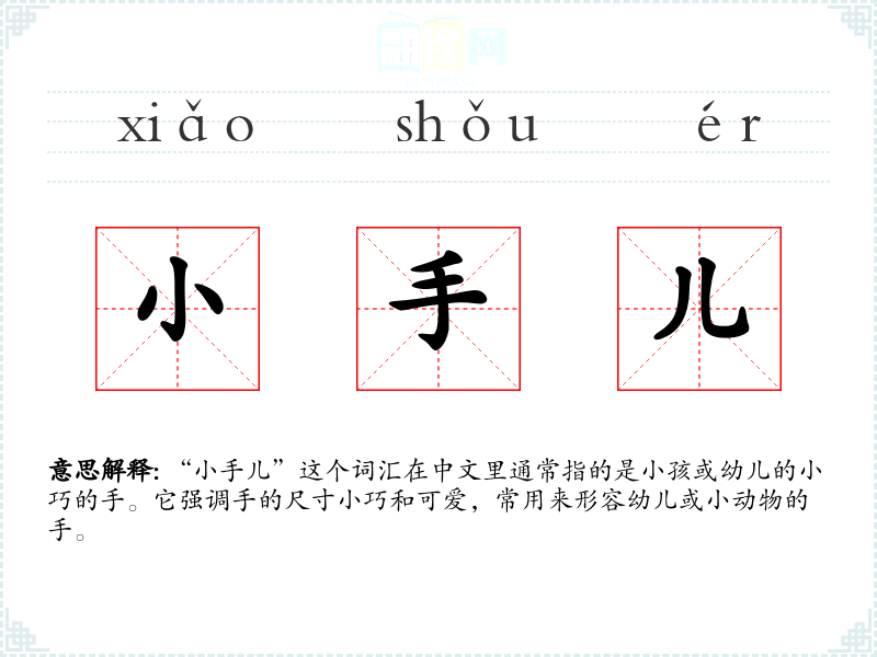 “小手儿”这个词源自古汉语,其中“小”表示尺寸小,“手”指人体的一部分。随着时间的推移,这个词在现代汉语中保持了其基本含义,但在使用上更加口语化和情感化。