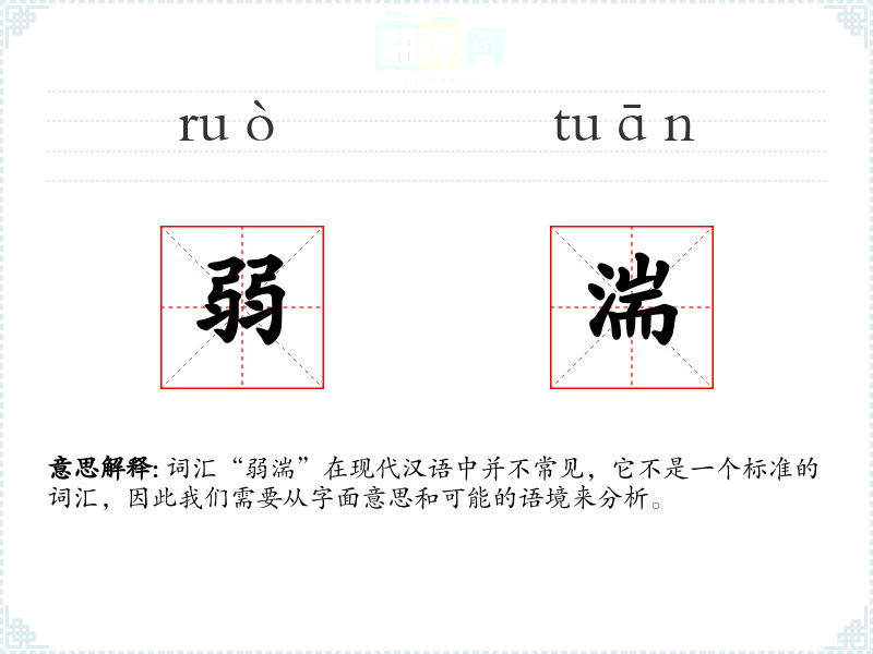 “弱”通常指力量小、不强或脆弱的状态,而“湍”则指水流急速、汹涌。将这两个字组合在一起,“弱湍”可能指的是一种看似急速但实际上力量不强的水流状态,或者比喻性地指某种表面激烈但实际上并不强大的现象。