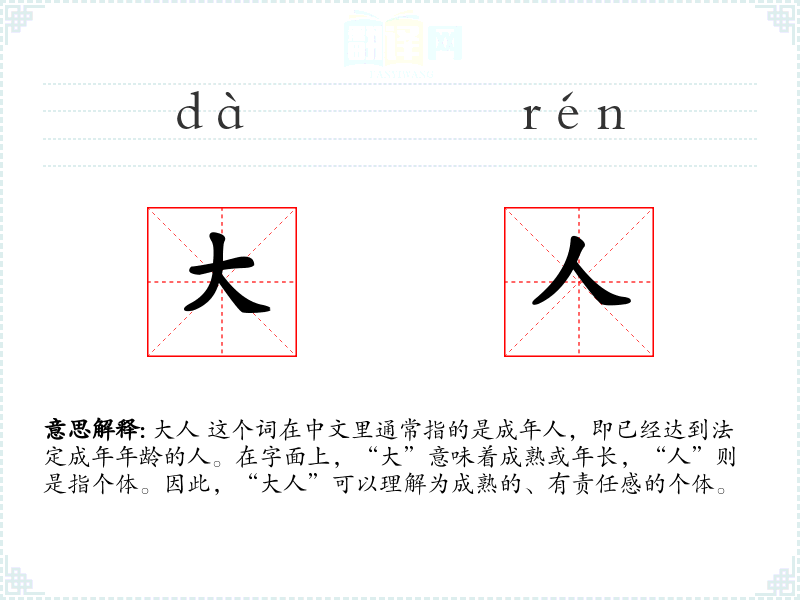 大人 这个词在中文里通常指的是成年人,即已经达到法定成年年龄的人。在字面上,“大”意味着成熟或年长,“人”则是指个体。因此,“大人”可以理解为成熟的、有责任感的个体。