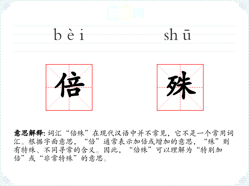- 总结理解:“倍殊”是一个强调事物特殊性和重要性的词汇,虽然在日常交流中不常用,但在强调某些特别情况时,它可以提供更精确的表达。