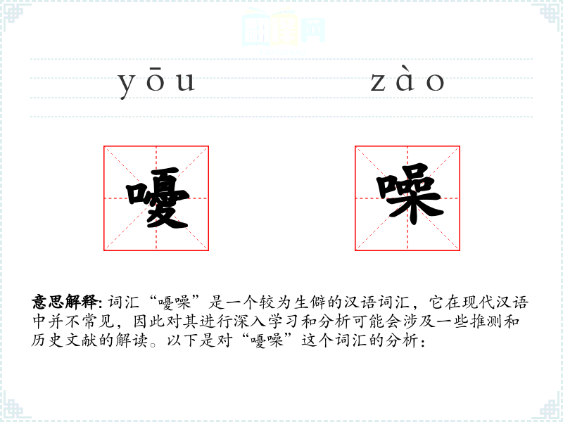 词汇“嚘噪”是一个较为生僻的汉语词汇,它在现代汉语中并不常见,因此对其进行深入学习和分析可能会涉及一些推测和历史文献的解读。以下是对“嚘噪”这个词汇的分析: