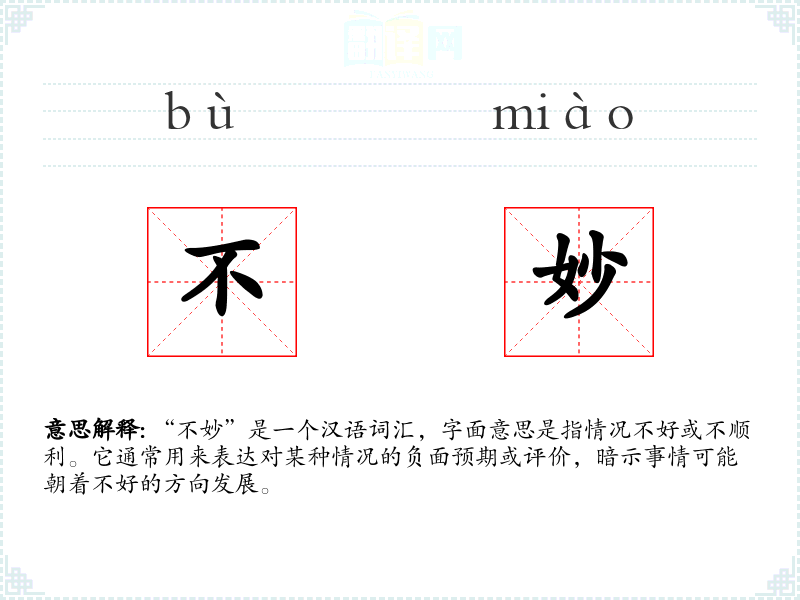 “不妙”是一个汉语词汇,字面意思是指情况不好或不顺利。它通常用来表达对某种情况的负面预期或评价,暗示事情可能朝着不好的方向发展。
