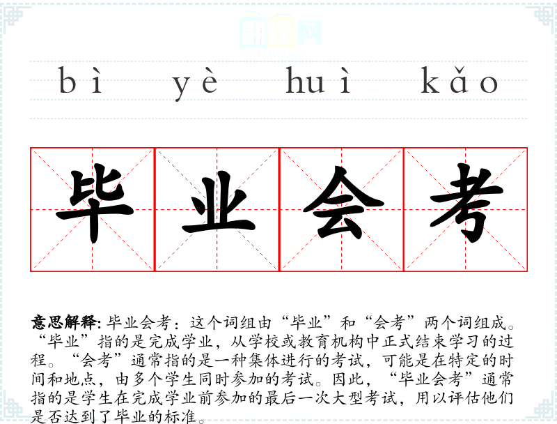 毕业会考:这个词组由“毕业”和“会考”两个词组成。“毕业”指的是完成学业,从学校或教育机构中正式结束学*的过程。“会考”通常指的是一种集体进行的考试,可能是在特定的时间和地点,由多个学生同时参加的考试。因此,“毕业会考”通常指的是学生在完成学业前参加的最后一次大型考试,用以评估他们是否达到了毕业的标准。
