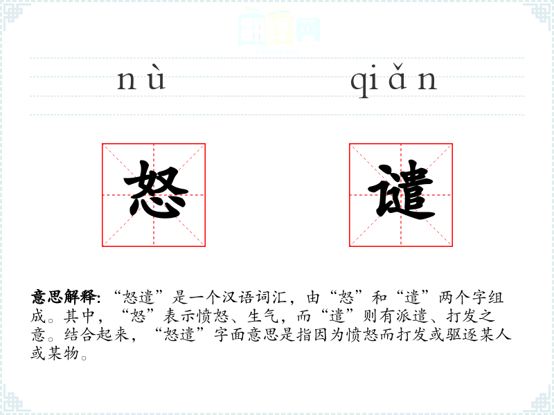 “怒遣”是一个汉语词汇,由“怒”和“遣”两个字组成。其中,“怒”表示愤怒、生气,而“遣”则有派遣、打发之意。结合起来,“怒遣”字面意思是指因为愤怒而打发或驱逐某人或某物。