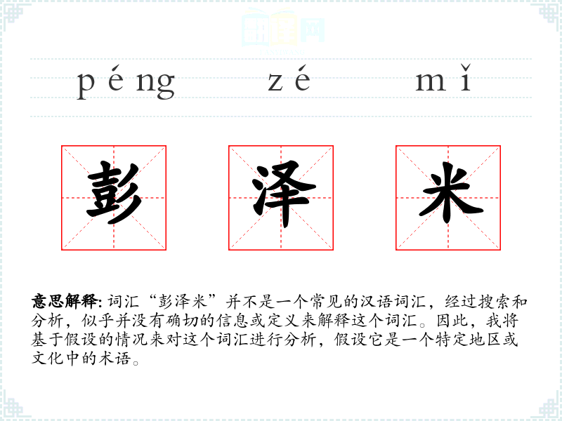 词汇“彭泽米”并不是一个常见的汉语词汇,经过搜索和分析,似乎并没有确切的信息或定义来解释这个词汇。因此,我将基于假设的情况来对这个词汇进行分析,假设它是一个特定地区或文化中的术语。